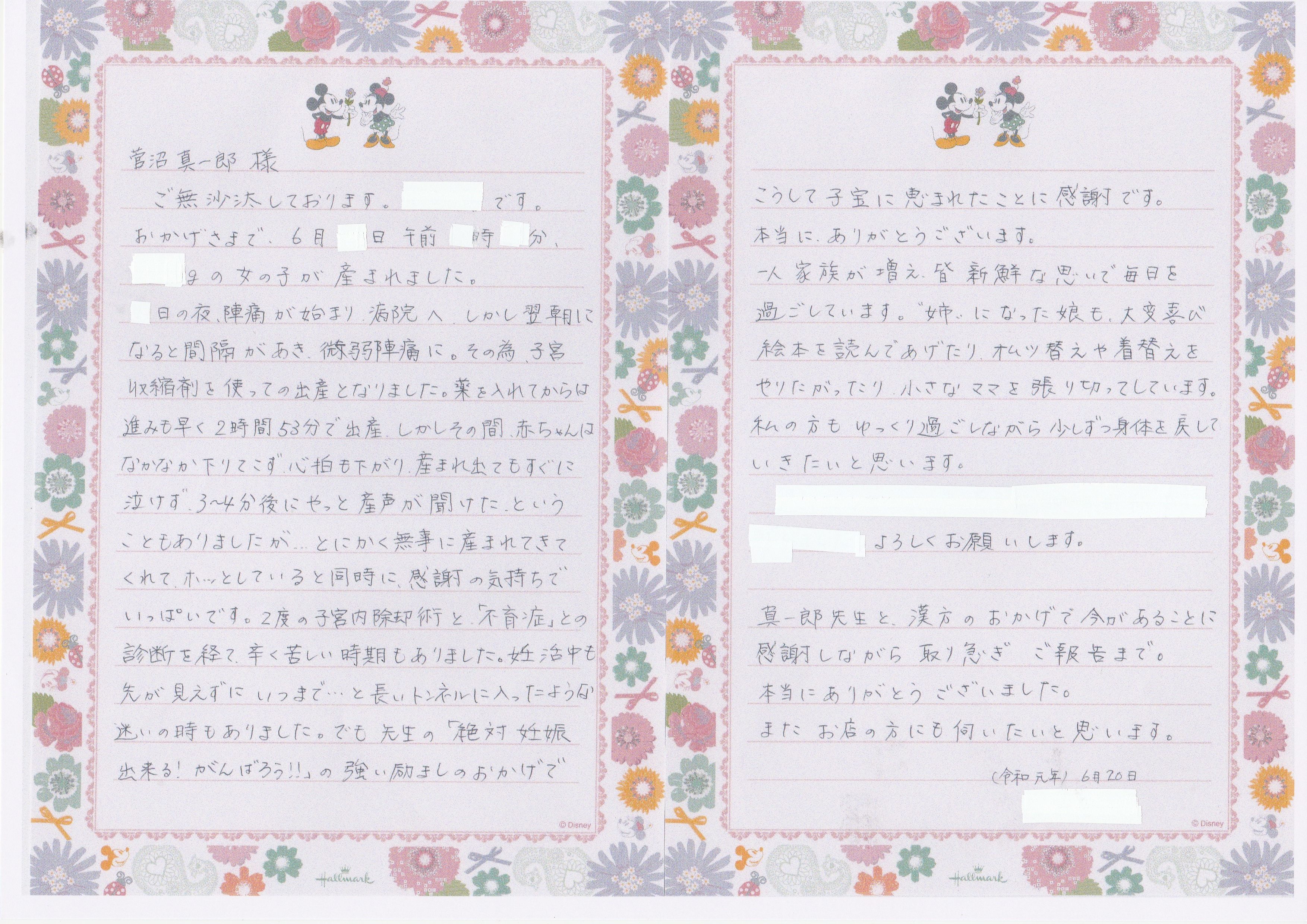 今日は、無事にご出産された常総市40歳のお客様より、ご出産のご報告のお手紙をいただきました。
