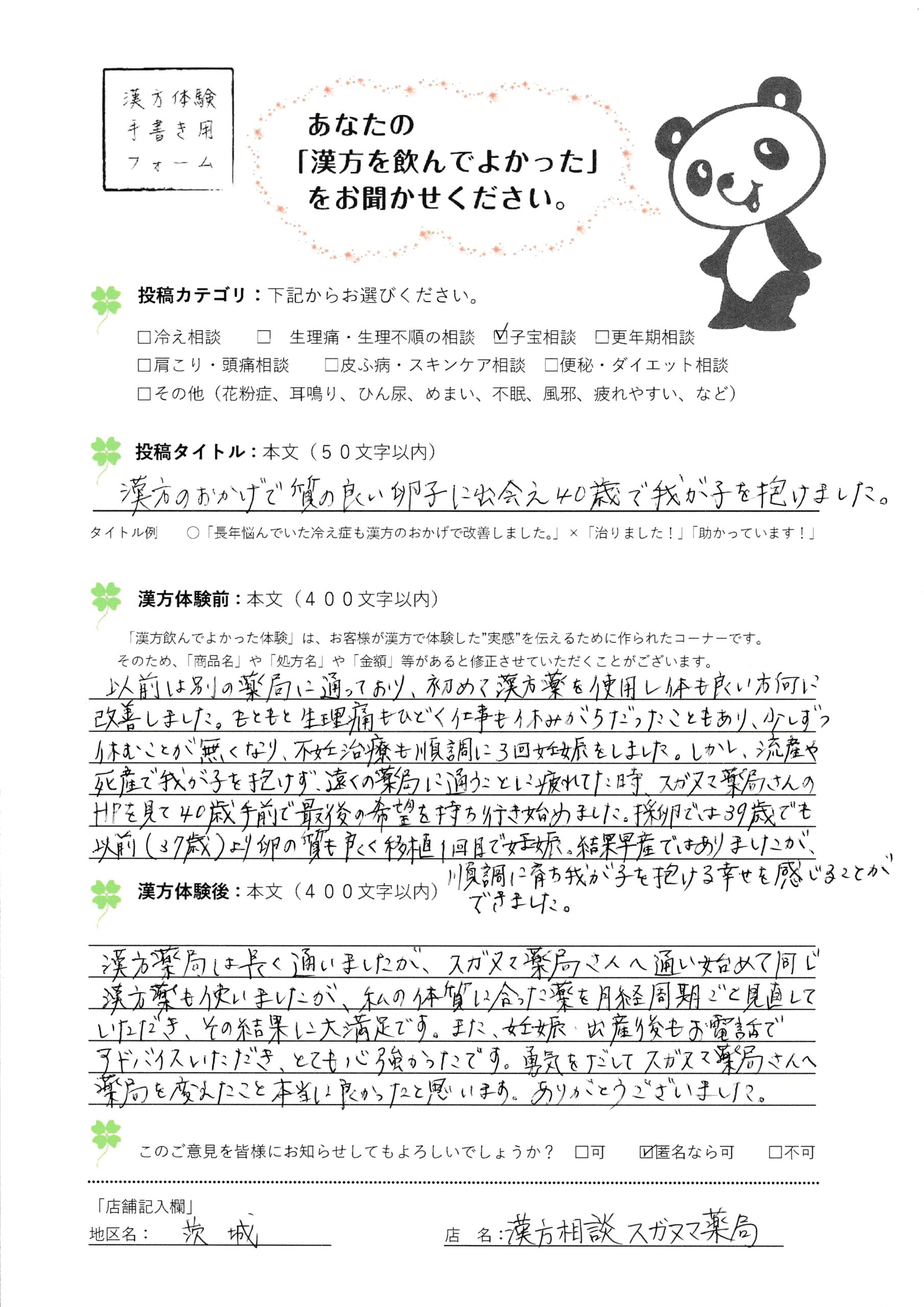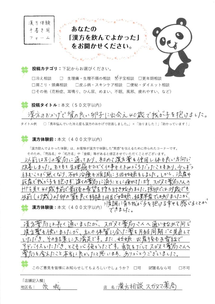 (妊活漢方体験談)漢方のおかげで質の良い卵子に出会え40歳で我が子を抱けました。つくば市40歳
