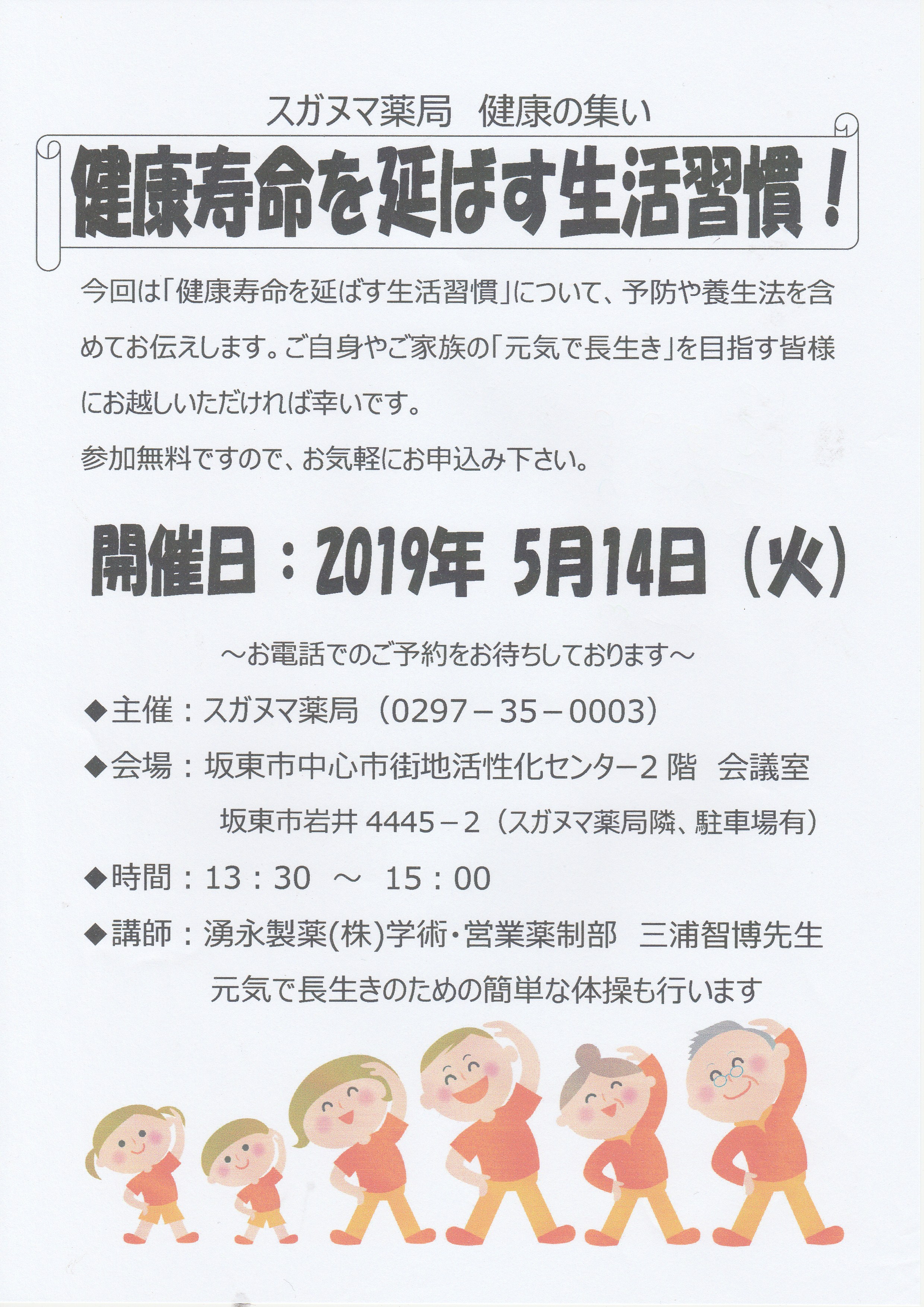 開催日 2019年5月14日(火) 13:30~15:00 会 場 坂東市中心市街地活性化センター2階会議室 住 所 坂東市岩井4445-2 主 催 スガヌマ薬局(0297-35-0003) 講 師 湧永製薬(株)学術・営業薬制部 三浦智博先生 参加費 無料 その他 元気で長生きのための簡単な体操も行ないます。