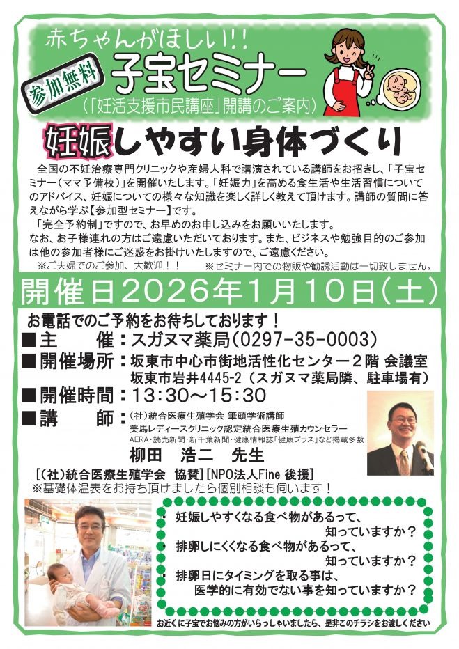開催日 2026年1月10日(土) 13:30~15:00 会 場 坂東市中心市街地活性化センター2階会議室 住 所 坂東市岩井4445-2 主 催 スガヌマ薬局(0297-35-0003) 講 師 (社)統合医療生殖学会 筆頭学術講師 柳田 浩二先生 参加費 無料 その他 ※基礎体温表をお持ち頂けましたら個別相談も伺います。