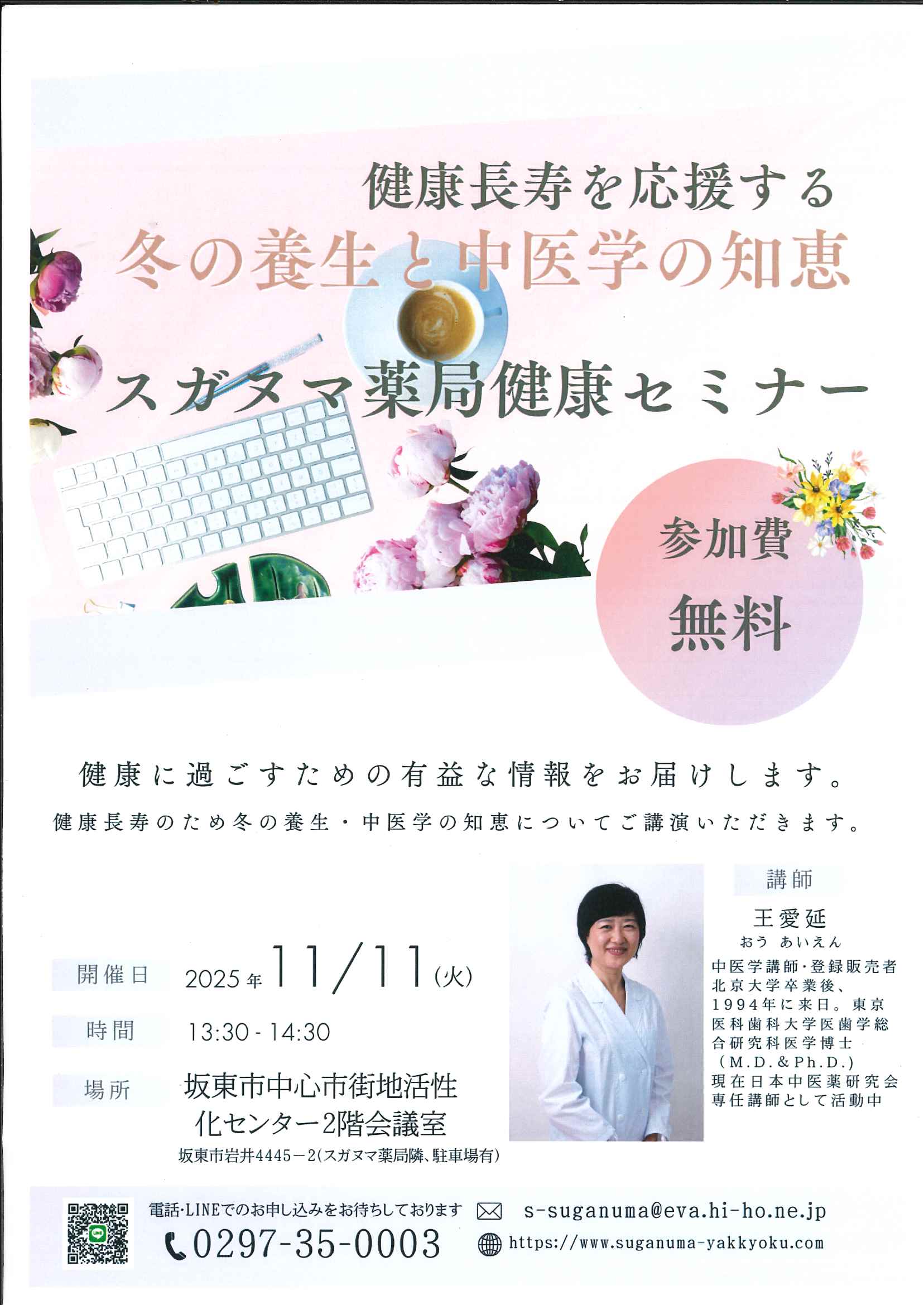 開催日 2025年11月11日(火) 13:30~15:00 会 場 坂東市中心市街地活性化センター2階会議室 住 所 坂東市岩井4445-2 主 催 スガヌマ薬局(0297-35-0003) 講 師 イスクラ産業・中医講師 王愛延先生 参加費 無料 - お申し込みはこちら