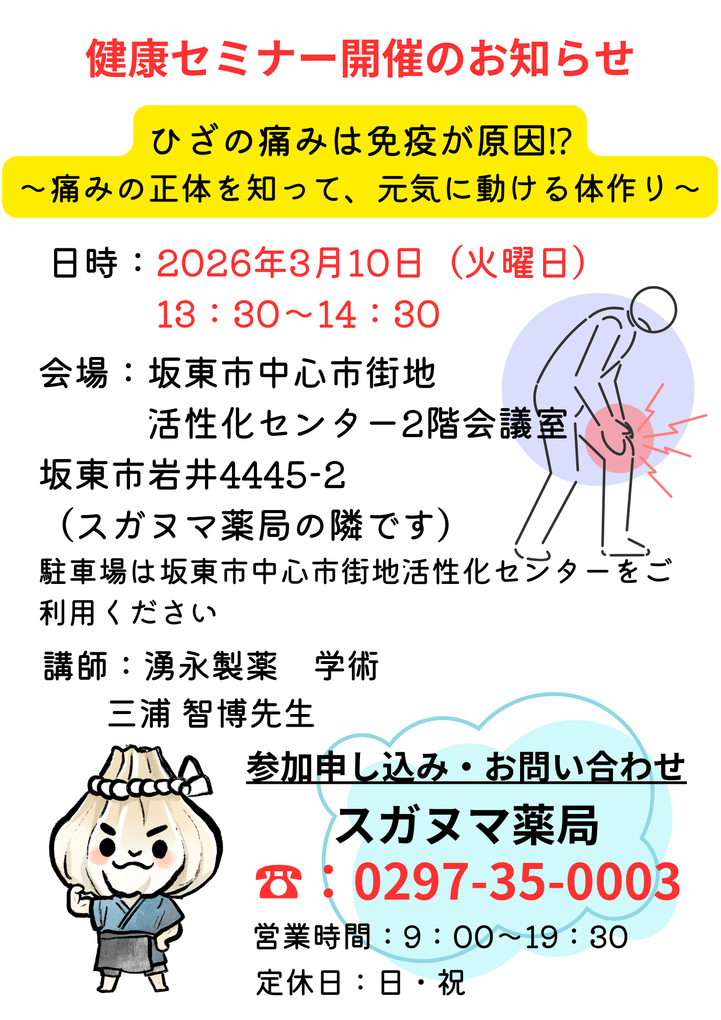 開催日 2026年3月10日(火) 13:30~14:30 会 場 坂東市中心市街地活性化センター2階会議室 住 所 坂東市岩井4445-2 主 催 スガヌマ薬局(0297-35-0003) 講 師 湧永製薬(株)三浦 智博先生 参加費 無料 - お申し込みはこちら